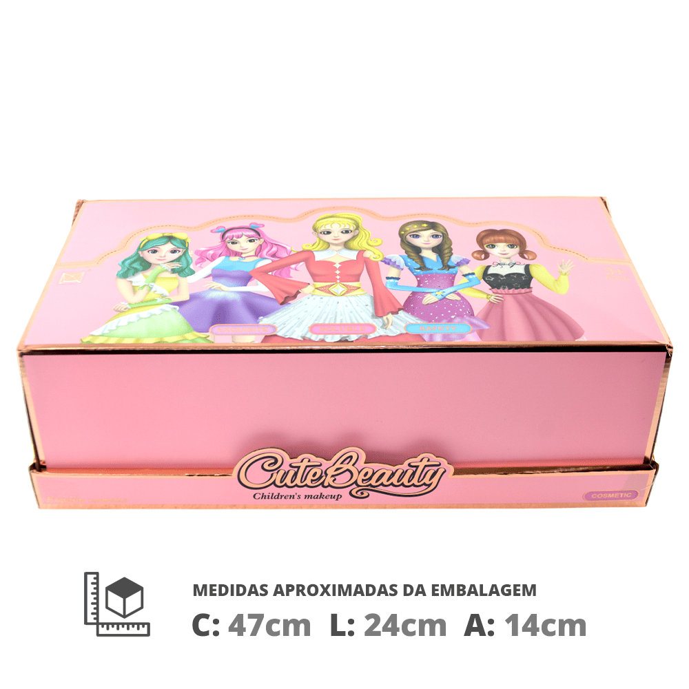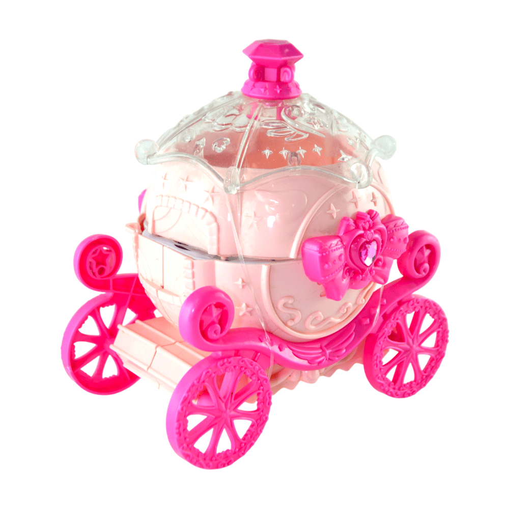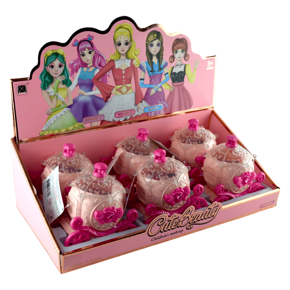 Com formato encantador de carruagem, o kit traz sombras coloridas, brilhos, batom, esmalte e aplicadores, convidando as crianças a soltarem a imaginação e criarem suas próprias produções de beleza de faz de conta.